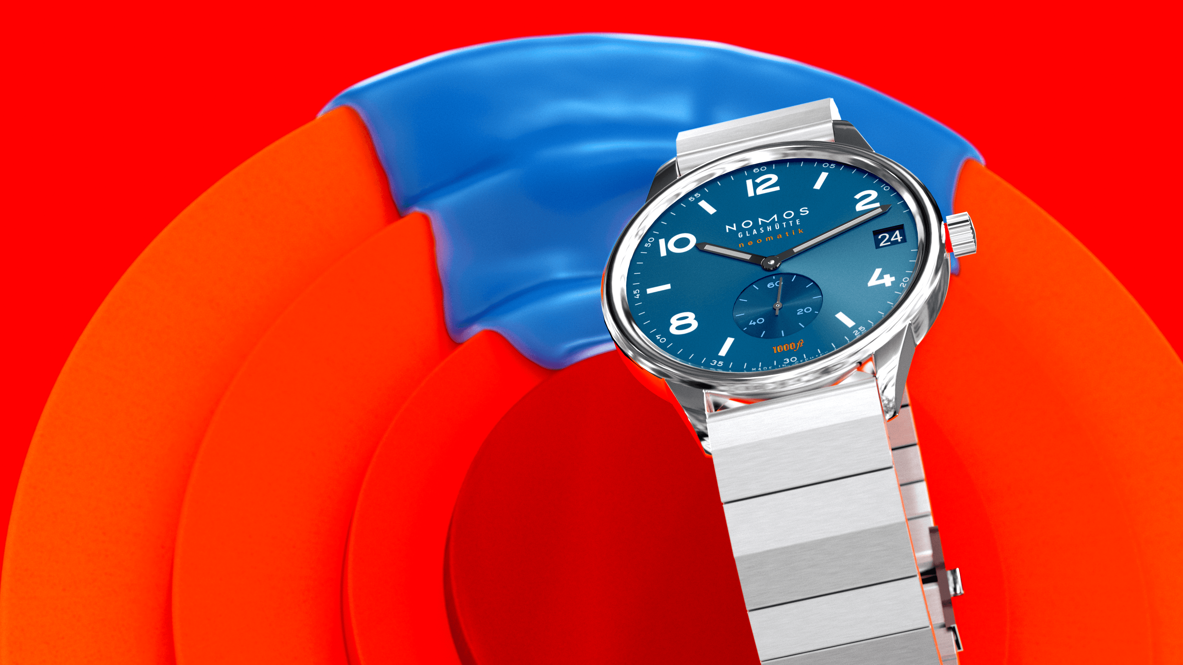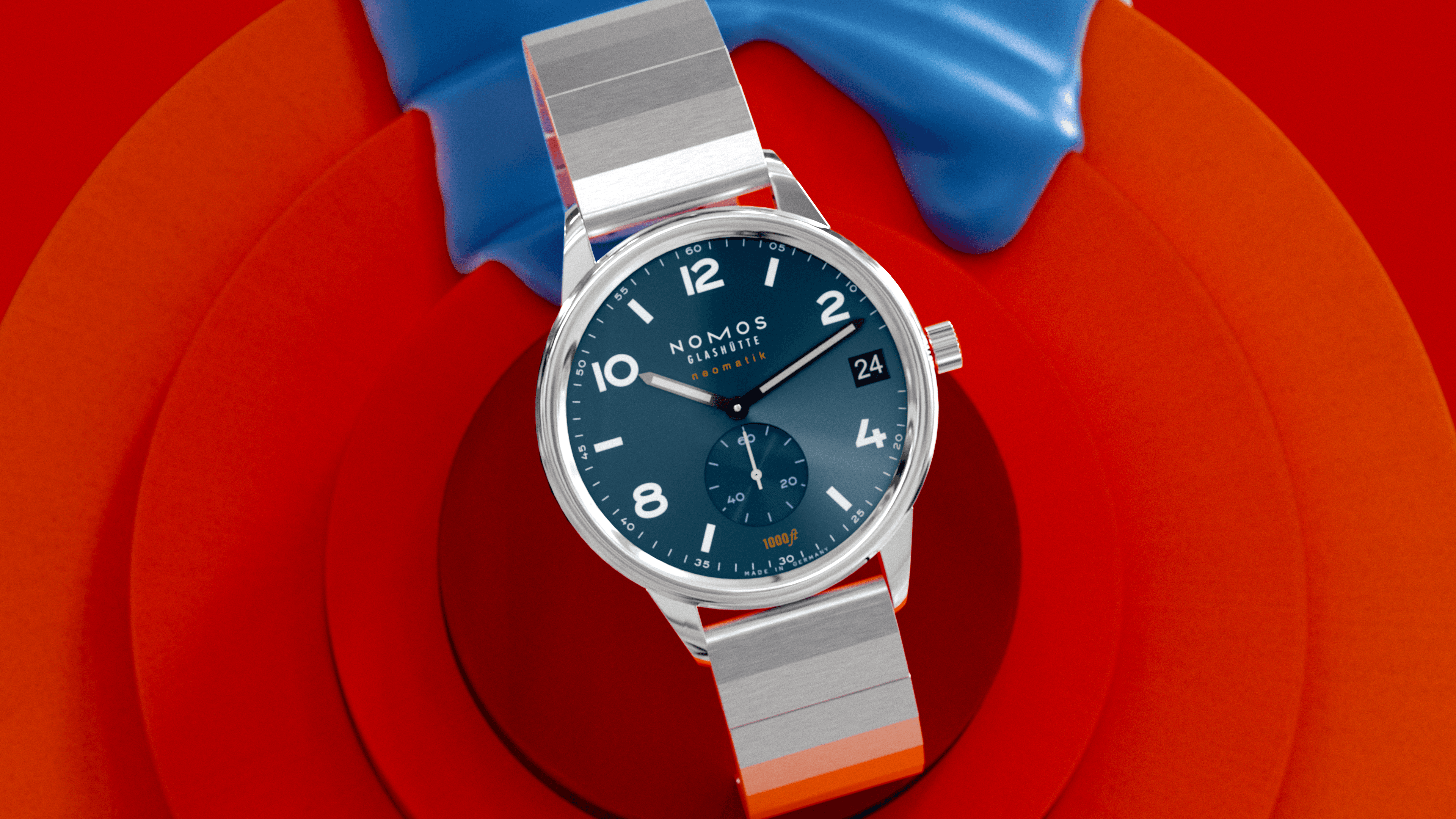 NOMOS Glashütte is a German independent watchmaker whose design language traces directly to Bauhaus principles — reduction, function, honesty of materials. The Club Sport Neomatik 42 Datum features an in-house DUW 6101 movement with 27 jewels, visible through a sapphire caseback, a deep blue dial, and a stainless steel bracelet. It is one of the most design-coherent sports watches in its category.